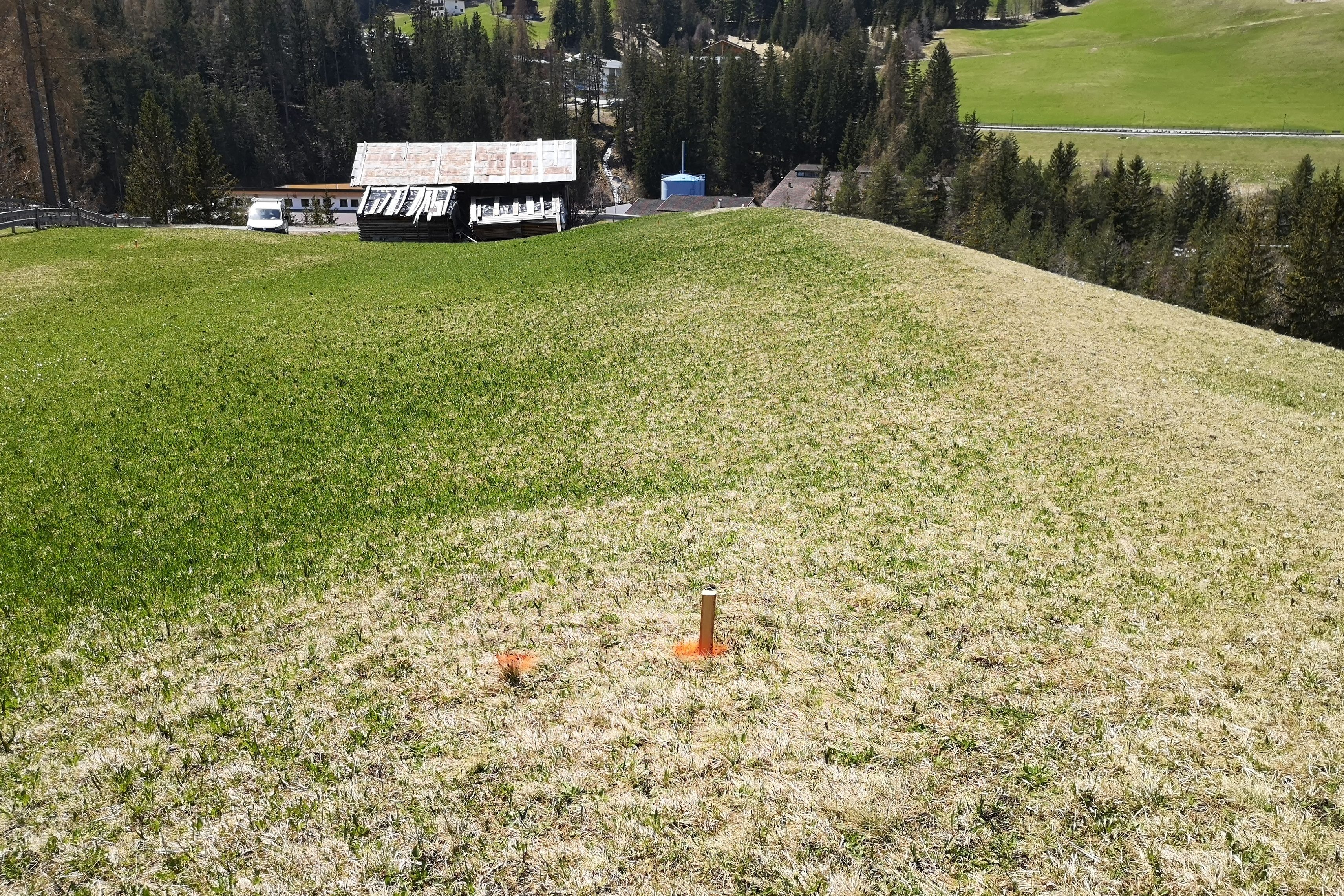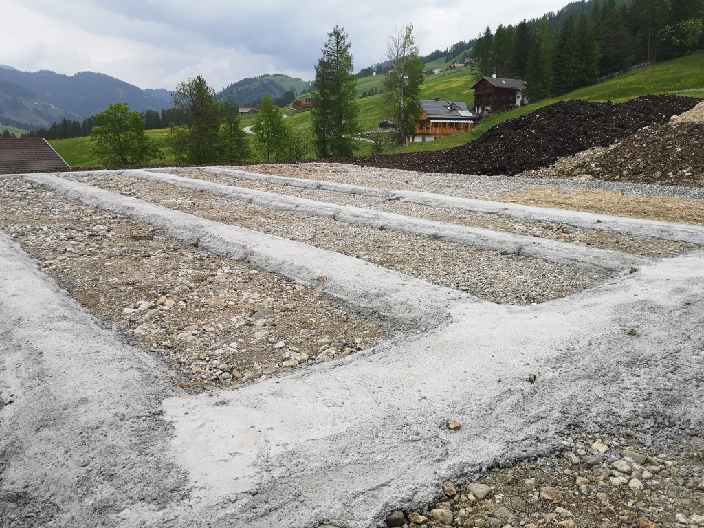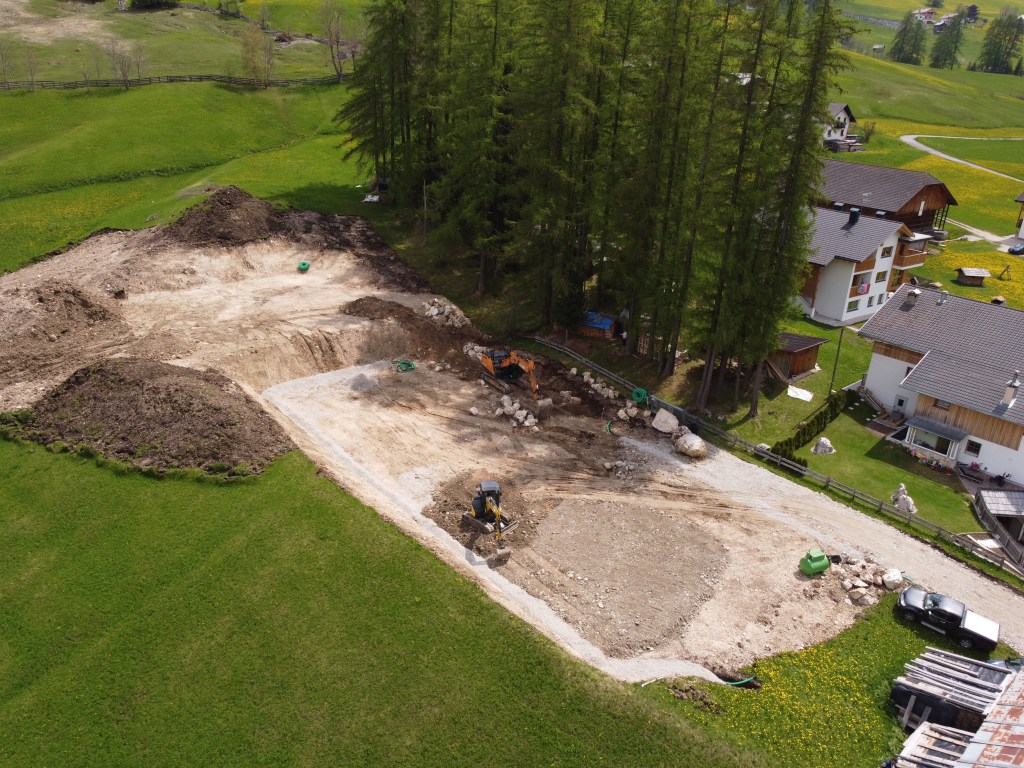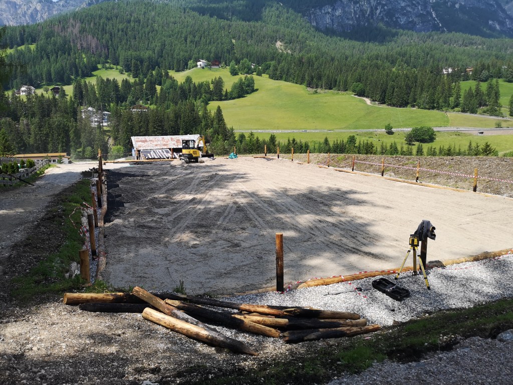 Il picchettamento sul posto viene eseguito prima di iniziare i lavori di scavo. In questo caso abbiamo anche subito avuto la possibilitá di correggere una differenza di quota del progetto dovuta all’utilizzo di sistemi di coordinate diversi.
